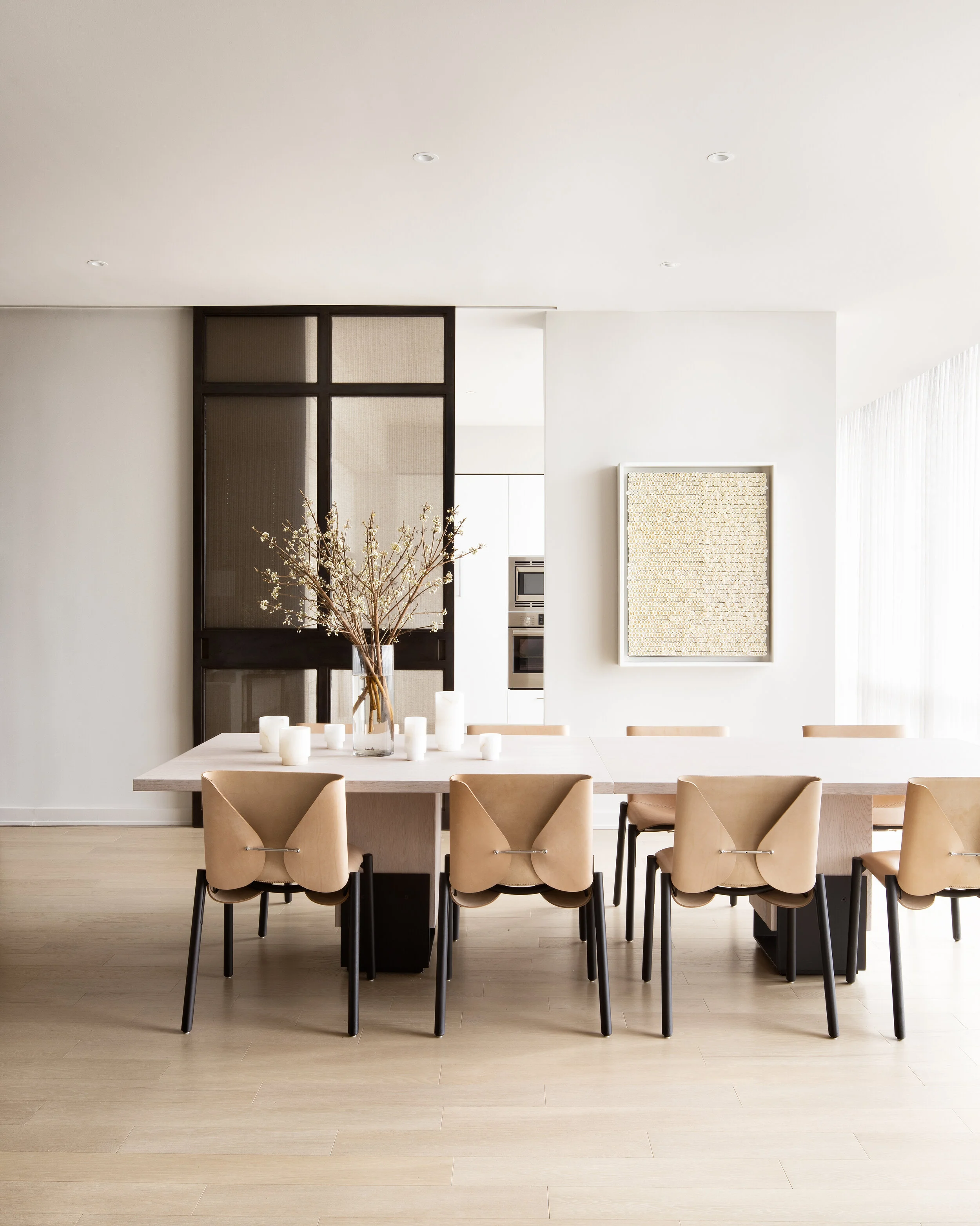 This neutral palette pied a terre apartment exemplifies the pure essences of elegance and modern design. The floor to ceiling windows attracts natural sunlight and dynamic city views, while the open concept allows for a great entertainment space. Mobile lighting has been positioned throughout the public spaces to contribute to the natural evening lighting.