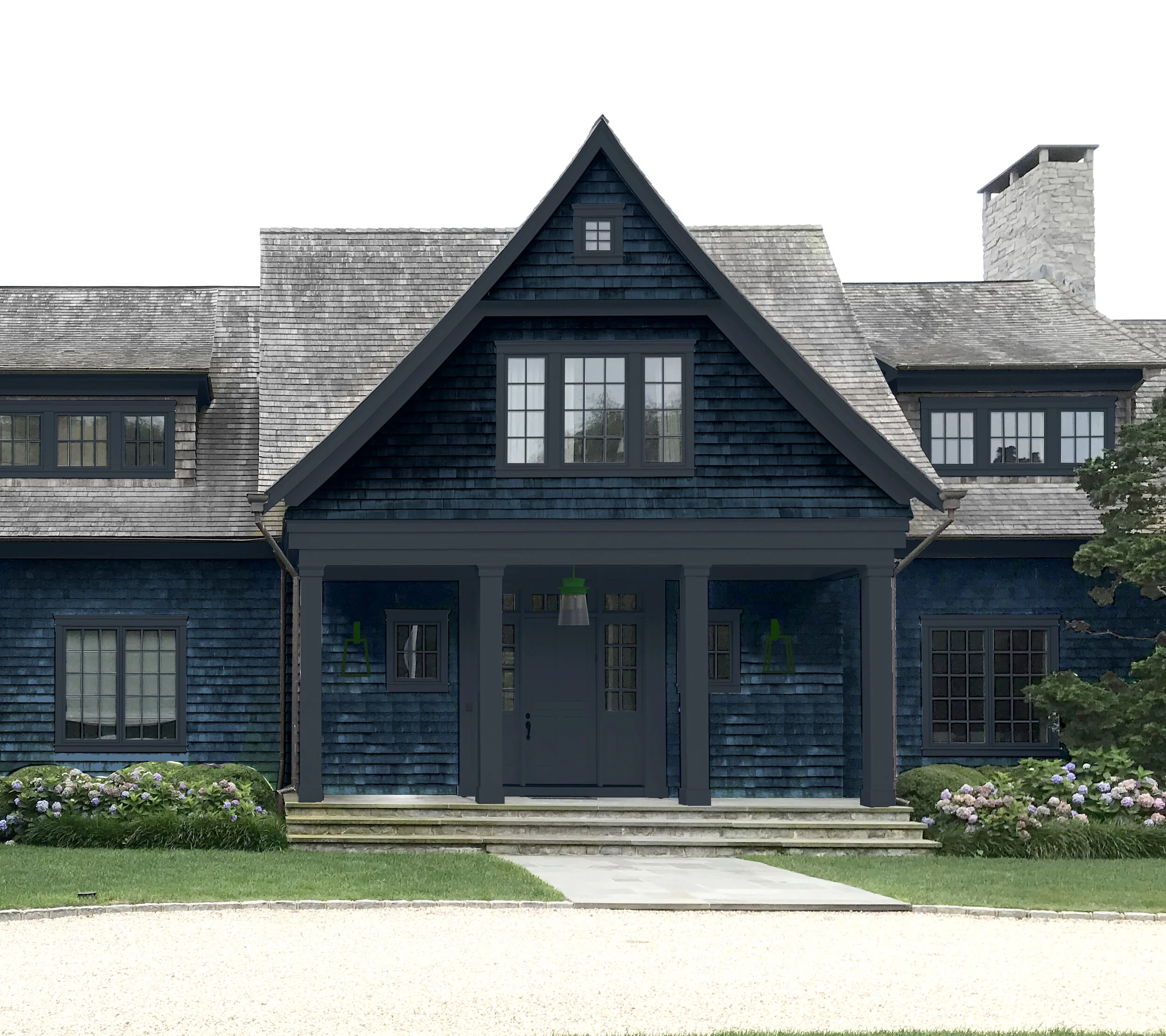 This Hamptons home has been modernized to change the general flow and elevate the overall feel of the home. The exterior landscape has been re-design to add more greenery around the home, and the shingles and columns have been painted a dark blue hue to tone down yet revive the home. The interior features furniture elements from French and Italian designers. There is a usage of dinesen wood throughout, along with banquette seating in the private and public spaces that adds additional seating in an intriguing way that feels more connected to the home.