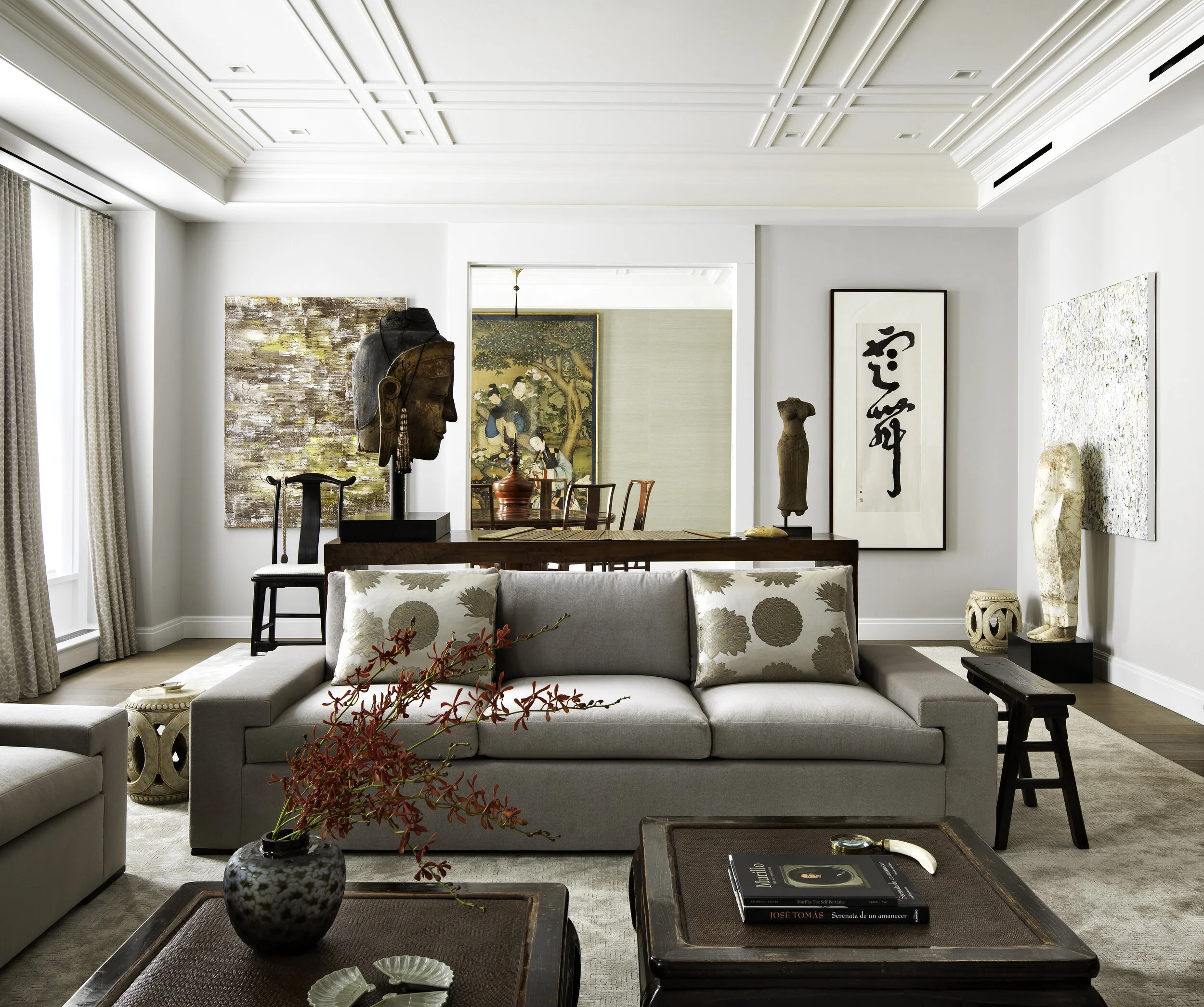 This Upper East Side apartment was heavily influenced by the clients extensive collection of Asian art. Minimal, cleanlined upholstery furniture is positioned conscientiously to celebrate the exotic art pieces. The palette was kept to neutral hues to balance the array of colorful statues and accessories. The three-dimensional pieces add depth and honor craftsmanship.